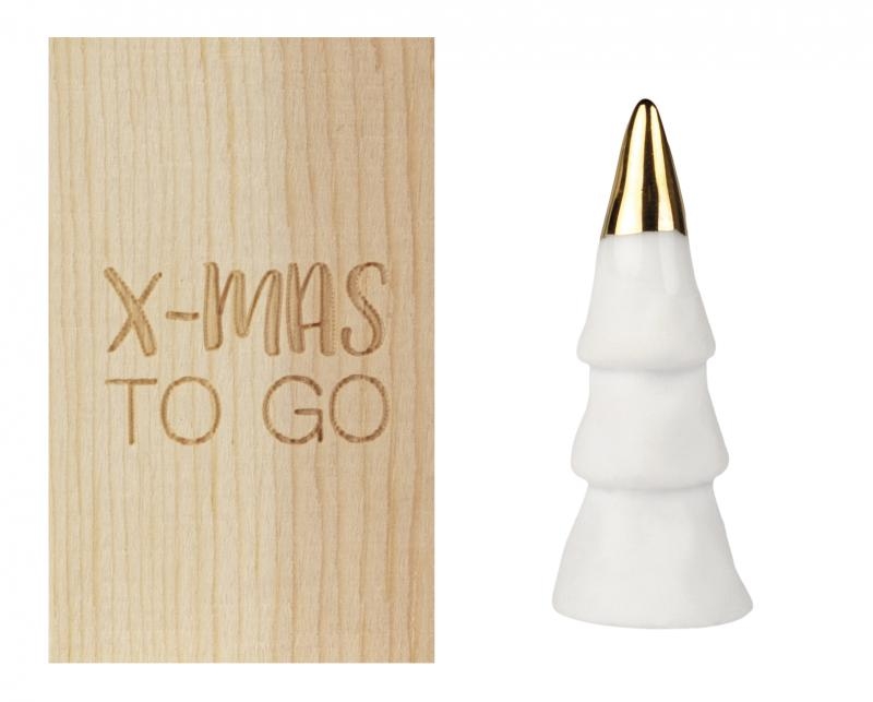 Mała, porcelanowa figurka w kształcie urokliwej zimowej choinki, która z pewnością stanie się piękną ozdobą każdego wnętrza. Na szczycie choinki znajduje się złota farba, dodająca elegancji i wyjątkowego charakteru. Figurkę umieszczono w solidnym drewnianym pudełeczku z napisem "X-mas to go", co sprawia, że jest to idealny pomysł na prezent dla bliskiej osoby, szczególnie w okresie świątecznym.