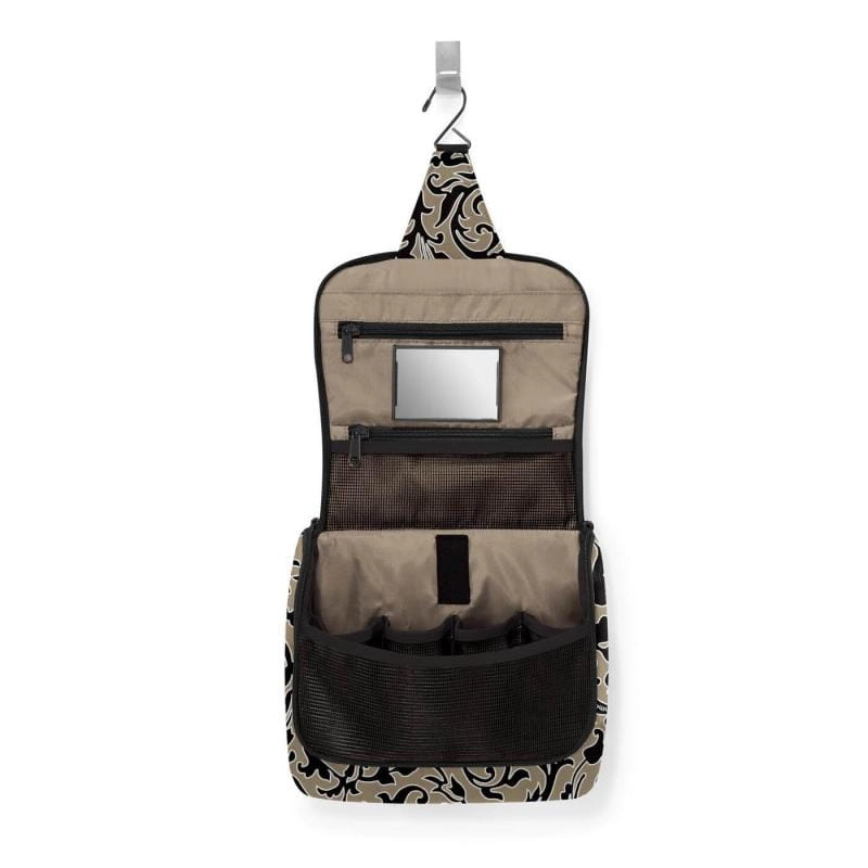 Rozkładana kosmetyczka z serii Toiletbag marki Reisenthel, przydatna w domu i w podróży. Wykonana z wysokiej jakości tkaniny poliestrowej. Posiada przestronną kieszeń główną wykonaną z przewiewnego materiału, 4 dodatkowe przegródki oraz 2 kieszonki na zamek błyskawiczny. Wewnątrz znajduje się również praktyczne lusterko zapinane na rzep oraz hak do zawieszania rozłożonej kosmetyczki. Dostępna w wielu wzorach, dzięki czemu mogą korzystać z niej zarówno kobiety, jak i mężczyźni. Rozmiar po rozłożeniu: 23 x 55 x 10 cm.